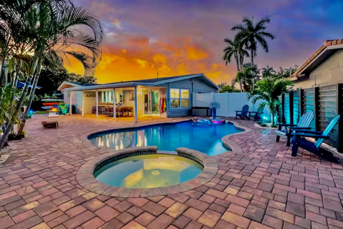 2 Bedrooms • 2 Bathrooms 2 Baths • Sleeps 4-8🌴 Coastal Oak — Waterfront Paradise! 💦 Heated salt pool (86° year-round), 100 ft of water frontage with kayaks, paddle boards & fishing dock 🎣. Just 5 miles to the beach with fire pit, BBQ, and multiple outdoor lounge areas for the perfect South Florida escape! 🏖