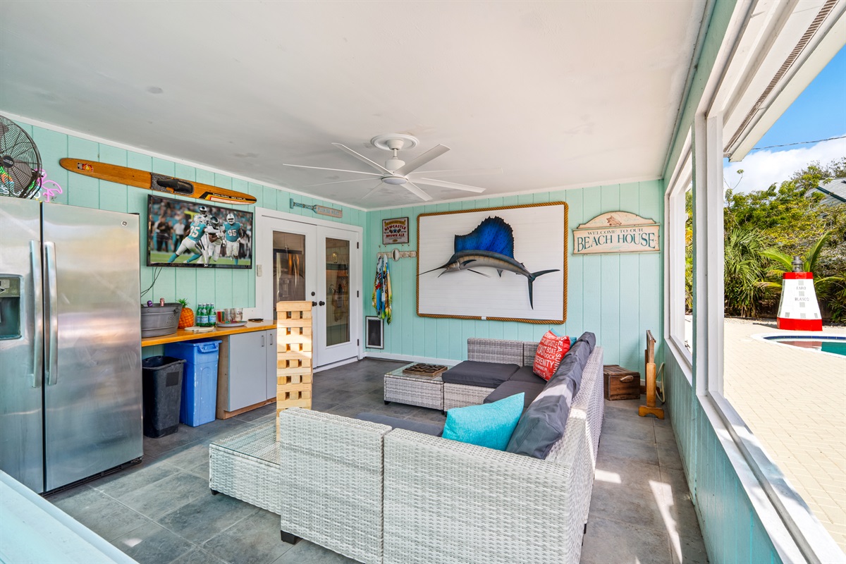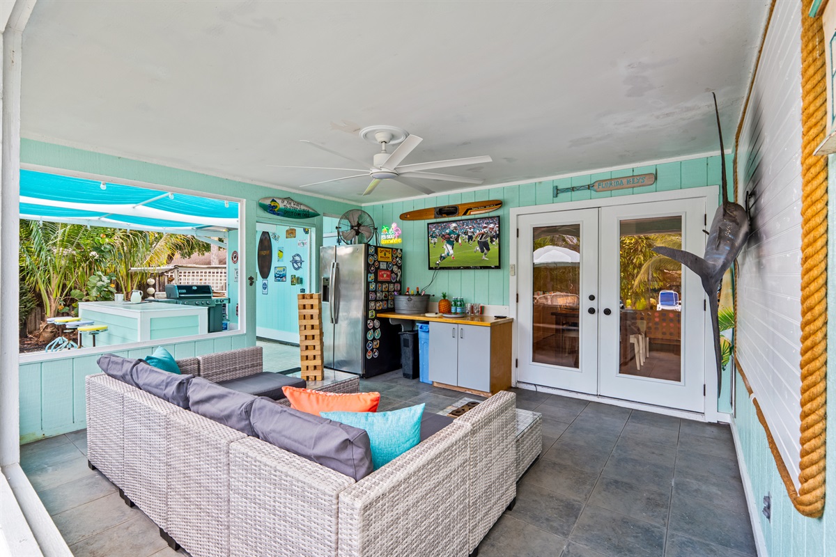 🛋️ Covered outdoor lounge with TV